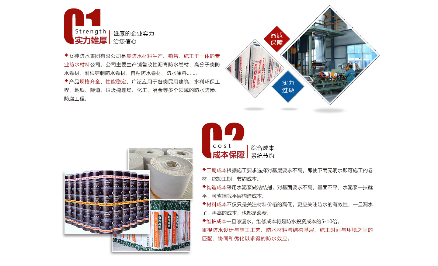 安徽女神建材科技集團(tuán)有限公司是集防水材料研發(fā)、生產(chǎn)、銷售、施工為一體的綜合性防水材料集團(tuán)公司。我公司旗下有多條大型一次成型生產(chǎn)線:SBS改性瀝青防水卷材,DTM聚酯復(fù)合高分子防水卷材,非瀝青基高分子防水卷材,PVC,TPO高分子防水卷材等生產(chǎn)線。我公司秉承“創(chuàng)新發(fā)展、實(shí)惠用戶”為宗旨,確保生產(chǎn)材料基礎(chǔ)上推出“共享生產(chǎn)廠家”,為開(kāi)發(fā)商、建筑商節(jié)約成本為理念,新理念受到用戶企業(yè)集采時(shí)一致好評(píng)和認(rèn)可。在互聯(lián)網(wǎng)時(shí)代,我公司將以互聯(lián)網(wǎng)“共享”為發(fā)展理念,為開(kāi)發(fā)商、建筑商、防水企業(yè)提供的產(chǎn)品,真正讓用戶企業(yè)達(dá)到巨大...